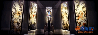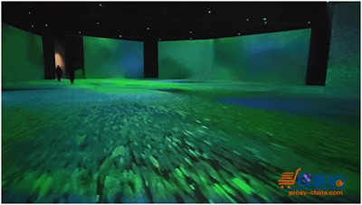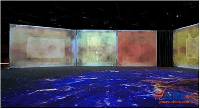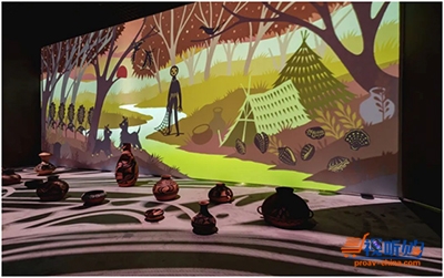 《图腾密码》展项采用6台Vivitek (丽讯) RU70983工程投影机,独创写意的远古动画影像从墙面覆盖至地面,生动还原5000年前的上古生活场景。而在场景之中,放置着形态各异的大小彩陶瓶,最为瞩目的当属人头型器口彩陶瓶,以人头像及抽象的线条结合,诗意的诠释中华文明最为古老的彩陶文化。