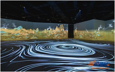 《江山新语》使用33台VVK RU70983工程投影机,打造气势恢宏的沉浸式体验空间。内容取材自中国十大传世名画之一的《千里江山图》,真迹现存故宫博物院。该作品以长卷形式,立足传统,画面细致入微,烟波浩渺的江河、层峦起伏的群山构成了一幅美妙的江南山水图。