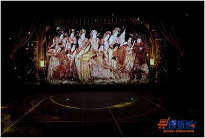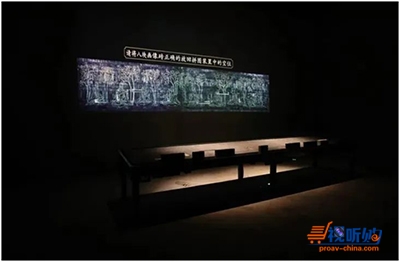 《大唐遗音》展项同样采用了感应交互装置,通过7台RU70983工程投影机呈现虚拟彩绘散乐浮雕影像。观众通过地面的各个感应区域,分别触发琵琶、箜篌、笙、座鼓等传统乐器,伴随背景画面的动态呈现,12位虚拟演奏者形态各异,仿佛梦回盛唐时期月舞笙歌的热闹场景。