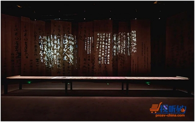 《万岁通天帖》作为唯一接近书圣王羲之真迹的书法珍品,有着极其珍贵的文献研究价值。展项内共使用2台Vivitek (丽讯) RU70983和6台DH3660Z工程投影机打造而成,空间纱幕呈现动态书写的书信文字,中间区域的条形长案同样以影像与之呼应,使观众在欣赏大师真迹的同时,也能感受作品背后的奇闻异事,体会中华传统书画艺术的独特魅力。