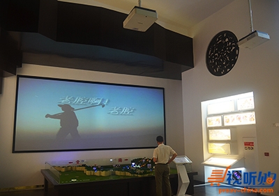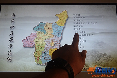 在这个方案中,我们看到触控屏上有一个地图,与沙盘相同,上面标记着渭南的不同区县,点击任一区县,旁边就会出现这个地区独具特色的文化艺术名称,而沙盘上相应区域的灯光也会亮起,非常醒目。接下来,只需点击名称,就可以在投影大画面中看到相关视频。