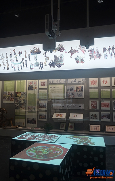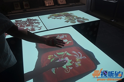 在手工艺展区,“剪纸”和“刺绣”都是重要展项,巧夺天工的各类剪纸和刺绣作品让人大开眼界,大多数作品尺寸较小,以精致细腻为亮点,而且还要收藏保存。如何能够仔细鉴赏这些精巧的作品呢?展馆应用了互动桌面投影系统,三台索尼VPL-F500X投影机吊置安装,将剪纸画面垂直投影在特制的“桌面”上。应用这一系统,剪纸与刺绣作品的细节毫厘毕现,让人们仔细观赏。并且,这一系统还增加了交互功能,人们可以像翻书一样,随意欣赏丰富的剪纸与刺绣作品。