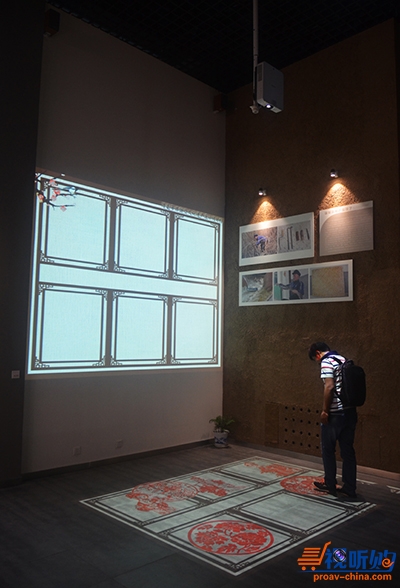 用两台VPL-F600X打造的墙面-地面互动投影系统,让人们可以放松心情,进行一些娱乐游戏,比如贴窗花,人们只需要用脚踩在选中的剪纸上,剪纸就会从地面“飘到”墙面“窗户”上。还有几种不同的小游戏,来到这里的大人和小孩都可以轻松玩乐,这也是很好的寓教于乐的方式。