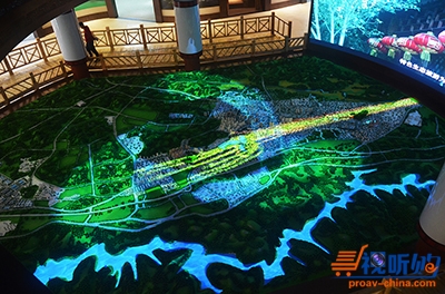 设计要求投影画面覆盖了整个沙盘,因此共应用12台索尼激光工程投影机VPL-F530WZ,采用4×3阵列的方式吊顶垂直安装,配合视频内容、光线效果、介绍语音以及立体模型,在沙盘上演绎耀眼眩目的瑰丽影像。