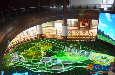移步到二楼,我们观赏到最核心也是最震憾的影像方案——大型数字沙盘。居高临下,可以对比旁边工作人员(下图左上)了解此展项的惊人面积。