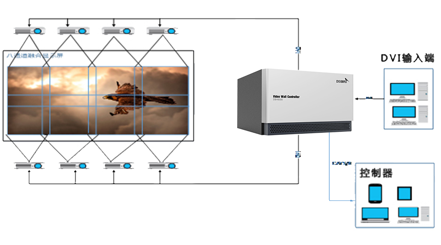 针对中核集团的项目需求,技术人员经仔细分析并结合经验,通过小鸟FCHD融合器对八路输出源进行信号处理,并显示到精准融合后的投影墙上,有效地应对了后端八通道投影拼接显示墙单元。