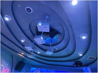 经常唱K的朋友都了解,老式KTV包房往往给人一种千篇一律的沉闷状态,东方国际大酒店的沉浸式KTV则打破了传统的KTV模式。得益于NEC骑士系列投影机的短焦优势,每间包厢采用8台CS3300WL(4000流明、WXGA分辨率、激光光源),通过拼接融合的方式,在三面墙体上打出大画面,让整个房间充满五彩斑斓的动感效果,带给人不一样的震撼视野和感官体验。即使拐角处,依然使用投影机投射,使整体画面的融合更加饱满,营造出浑然一体的视频效果。