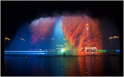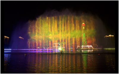 夜游昭阳湖公园的另一大看点当属湖中央的喷泉水幕。使用高压水泵和独特喷头将水高速喷出并快速雾化,在空中呈现约1000平方米的银幕效果,再依托1台NEC旗舰级双色激光工程投影机,将人文初祖、楚韵遗风、垛城记忆、湖荡传说等当地文化投射到水幕上,打造炫酷的沉浸式体验,吸引入园游览的市民驻足观看。
