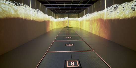为了配合松下投影机清晰、高质量的视觉内容呈现,BeamSystems公司还特别安装了振动地板装置,当游客置身其中时,通过复现工厂灌装车间装瓶过程中生产线的声响、光影与震动频率,为参观者打造身临其境的多元感官体验。