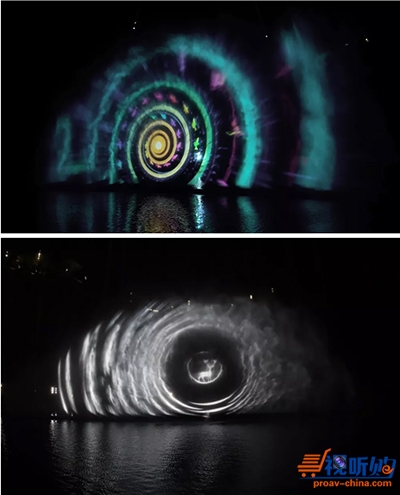 在表现形式中,选择了新颖并具有极佳宣传效果的水幕投影。所谓水幕,是通过高压水泵和特制的水幕发生器,将水自下而上高速喷出,雾化后形成的“银幕”,再由投影、灯光等机械设备将视频投射在“银幕”上,形成了水幕投影。