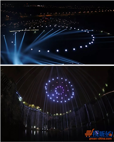 除了酒店本身的建筑亮点,夜晚的亮化设计也极具创意。酒店开业当天,灯光和无人机为其助阵。6台31,000流明松下激光光源工程投影机打造传奇水幕秀,在这有着天然回音结构的环形深坑中,配合无人机灯光阵型表演,水、陆、空三维演绎回旋激荡的创想艺术空间。