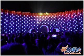 这个禅音墙是整场演出的第一个单元,整座墙面由228个铃铛组成,面积达600平方米。配合着不同的灯光效果,夜幕下的禅音墙也随之变换色彩,僧人手持红灯依次蜿蜒蹬至墙顶,伴随着美妙的梵音和低沉的老者解说,游客仿佛被带入了另一个世界。