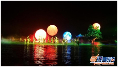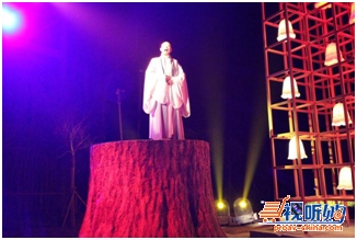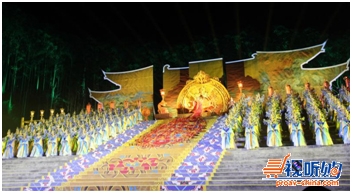 在演出的同时,莲花剧场缓缓转动,外部的花瓣墙体也随之打开,室外的山林宫墙,湖上,和广场三个表演场所依次呈现在观众眼前,室外的山水和室内的舞台多维度空间交替演出,将整个故事串联起来,场面宏大,气势磅礴。