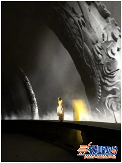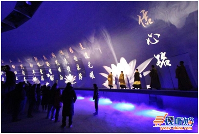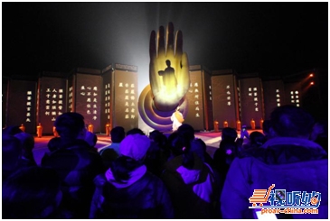 时空隧道的尽头是一排宽45米的巨大屏风。为了将经文画面完整投映出来,同时又可以达到渲染氛围的效果,赢康配合每扇屏风的不同角度设计了投影画面,经过细致的融合处理,投影画面变得效果十足,十分精彩。在投影机的安装方式上,采用赢康设计的户外安装方式,使投影画面更加灵活流畅。随后,屏风打开,高达9米的巨型佛手徐徐推出,金色的投影画面立即投射在佛手上,六祖慧能的故事正式开始。