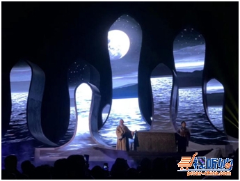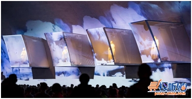 作为该项目实景演出的视频工程商,赢康为莲花剧场精心设计了投影方案。剧场内部的主要舞台背景由十几个片状纱幕拼接组成,投影机将画面分别投射在纱幕和地面上,使分离的纱幕和地面浑然一体,随着故事的不断发展,投影画面频繁变化,不同角度,不同时空,配合剧场旋转多次使用,使整场演出声声入耳,幕幕惊心,叹为观止。