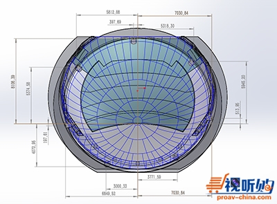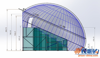 首先,为了让观众获得身临其境的感官体验,该馆通过增加球幕高度的办法来提高包裹感,剧场最前方的地面也被设计成投影的一部分,这就加大了投影设计的整体面积,同时该球幕为异形球幕,靠近座椅与地面的位置需留出通道空间,这些条件都增加了投影设计的难度。