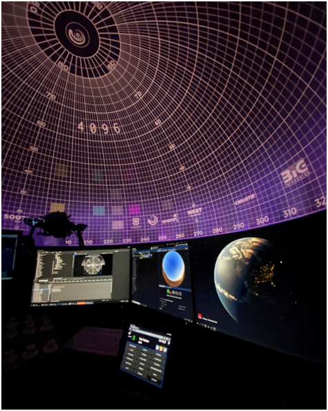两台 Griffyn 投影机分别负责球幕的南、北半球投影,并覆盖约 70% 的球幕,确保有足够的重叠部分可供进行几何校正和边缘融合。投影机配备用于弯曲表面的 Navitar 镜头,确保 90% 的均匀聚焦。
