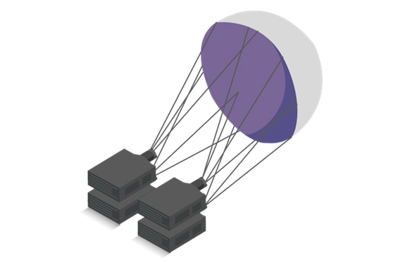 基于本项目所采用的三部相机,Mystique 可以自动进行几何校正和边缘融合。只需轻击就能对齐多台投影机并完成边缘融合。
