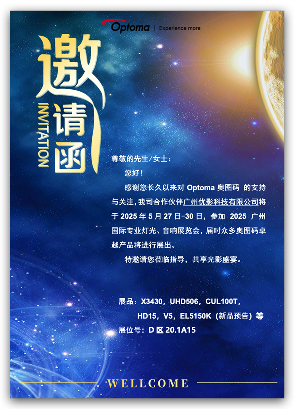 感谢您长久以来对Optoma奥图码的支持与关注,我司合作伙伴广州优影科技有限公司将于2025年5月27日-30日,参加 2025广州国际专业灯光、音响展览会,届时众多奥图码卓越产品将进行展出。