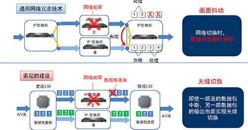 索尼IP LIVE系统具有独特的、真正的系统冗余备份,系统中任何一个设备端口全部是双网口,并通过双交换机,双网络管理服务器,实现真正的IP双网结构,真正实现同步、视频、音频等信号的无缝倒换,保证直播的高安全性和高可靠性。
