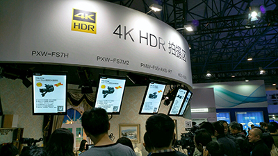 索尼室内展台分为4K及XDCAM摄像机环形拍摄区、HDR片花展示播放区、手持一体机柱式互动区,等多个区域。