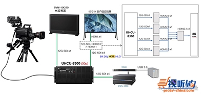 本场8K测试由一台UHC-8300为主体组成单讯道8K系统,系统结构如下图所示。