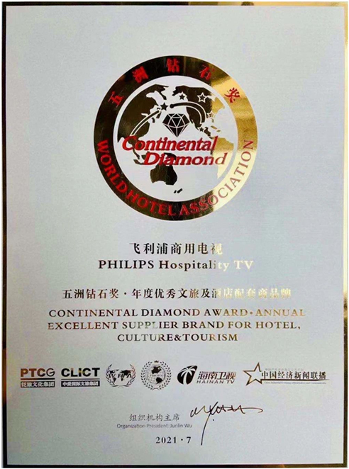 7月29-30日,“2021年文旅国际峰会暨第十四届世界酒店论坛”于海南海口隆重举办,飞利浦商用电视在众多品牌产品之中脱颖而出。并续2020年后,经组委会的一致决定后再次斩获“五洲钻石奖·年度优秀文旅及酒店配套商品牌”,受到广大用户及市场的认可。