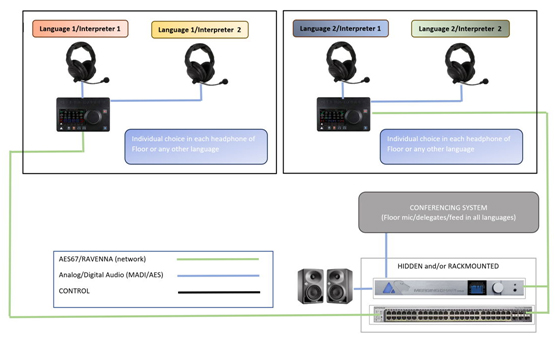 所有Anubis均通过网络互联互通(AES67/ST2110),因此每个音频流在任一Anubis上均可用。Hapi Mk II(AD/DA、Madi、AES/EBU转换器)拥有所有标准格式,作为输入/输出点连接到现有的控制台、PA或会议系统。这种口译解决方案的一个主要优点是,它能通过VPN和每个Anubis的IP地址进行远程控制。