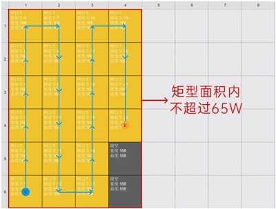 常规LED显示屏中,单个网口带载是按照外接矩形内的像素,不论如何走线,是否留空;矩形面积超过65W像素就会超载。