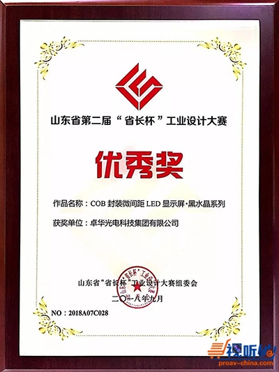 近日,山东省第二届“省长杯”工业设计大赛获奖名单出炉,Voury卓华黑水晶系列COB封装LED显示屏获“省长杯”工业设计大赛优秀奖。
