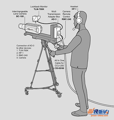 我们将回看视频信号从CCU-200传输到AD-3,方便摄像师于摄像机视频及PGM视频间切换监看。