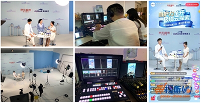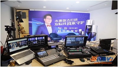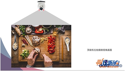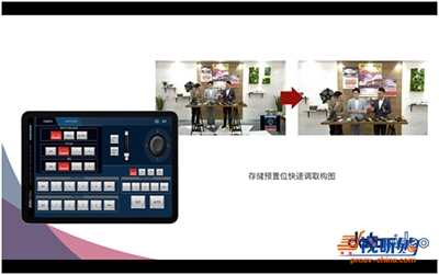 系统中一台装有洋铭免费控制软件的平板电脑作为控制面板,用这台平板电脑设置摄像机(CAM1和CAM2)的参数,可以存储、调取摄像机的预置位。两台Datavideo洋铭云台摄像机,一台用于主播正前方,拍摄现场全景,另外一台吊装在主播桌正上方,使用顶机位拍摄主播桌上的产品细节。