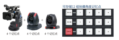 每台PTC-T系列摄像机可以预设并存储四个拍摄角度记忆点,三台摄像机一共能够存储十二组记忆点,导播可快速改变拍摄角度。只需要按一个按键即可达到定位,不再需要指挥前场摄像师。一人即可包办前场摄像机操控、后场导播切换,再也不用为拍摄团队人员不足而烦恼。