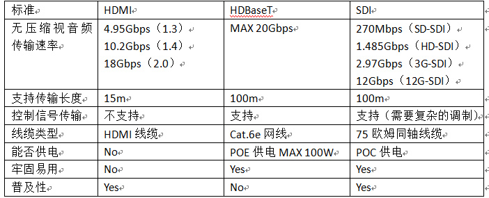 或许一些朋友对这种传输技术仍然不熟悉。没关系,我们直接用HDBaseT与现今常用的HDMI,SDI做一个对比。