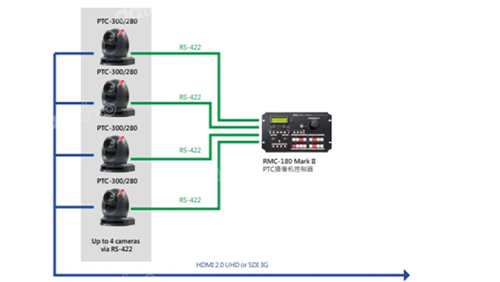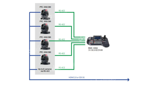 通过 RMC-300A 云台摄像机控制器与 DVIP 控制协议, RS-422 接口可控制多达二十四台PTC-280
