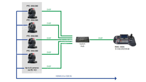 可通过RS-422和以太网网络与大型控制系统连接,使用DVIP或VISCA控制协议操控摄像机PTC-280,最多可实现24台PTC-280同时控制。
