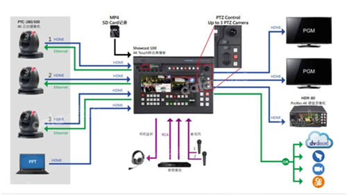 可搭配洋铭4K触摸移动演播室Showcast100实现导播切换推流摄像机一体控制的直转播解决方案