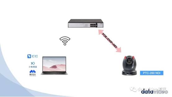 洋铭新推出的4K 50//60p 大广角网络云台摄像机——PTC-280 NDI,除了传统的RS-422接口、NDI接口还有datavideo专有的DVIP接口,可同时向两个平台进行推流直播。它还可使用POE交换机直接供电,并且提供网络,连接会议软件十分方便。