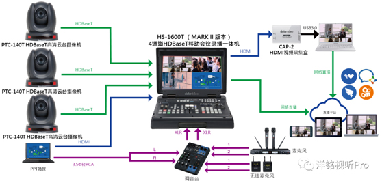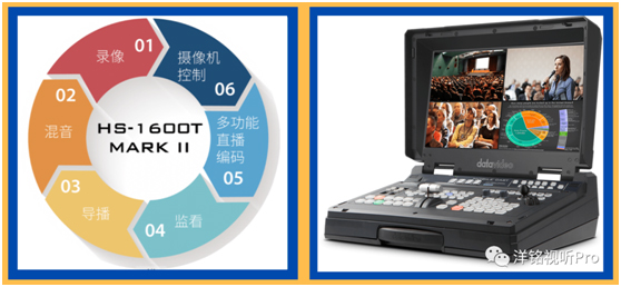 中间信号处理单元为Datavideo洋铭4通道HDBaseT移动会议录播一体机HS-1600T(MARK II版本)。这套移动便携设备专为视频会议直播录播设计:既能切换多台摄像机与会议电脑信号,还能够直接远程控制现场摄像机的拍摄构图,每个机位可预存4个预置位并快速调取使用,实时进行本地录像和推流直播。这款设备全硬件设计,接口丰富,具有大按键面板、单键单功能,4:4:4 10-bit内部信号处理,广播级音视频接口标准,可监看多源信号,含常用特技转场及音频监听、混音等等功能,是一款高度集成的广播级视频会议重要设备。