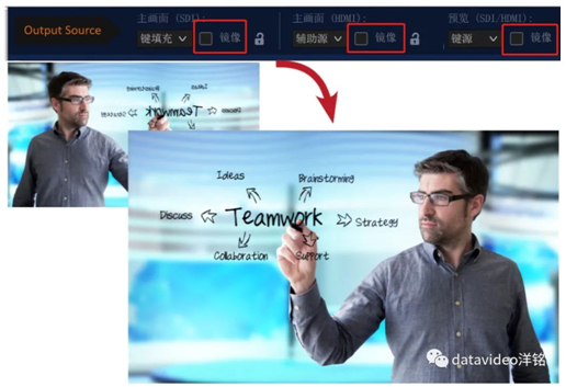 在我们实际的应用中,我们可能会遇到讲课的老师或者是节目的主持人或者嘉宾看自己在返看中的影像是相反方向的,这会给镜头前面的老师或者是主持人带来很多的不适应。而洋铭DVK-400对每一路输出都可以做镜像设定,且设置操作简单。我们只需要在菜单里找到镜像的选项进行一键勾选,我们便完成了一路的镜像效果设定。这样就方便我们的主持人、演讲者或者是嘉宾,能更好的适应习惯的返看效果,不会产生左右是反向的不适应感觉。