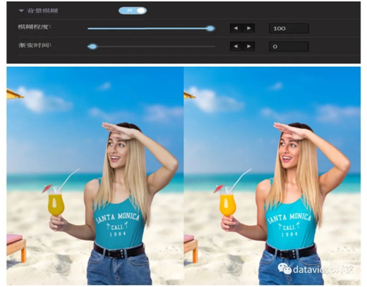 通常,我们在抠像结束之后,都会用一个新的背景进行叠加,而我们为了实现一个有景深效果的叠加的时候,比如我们在虚拟环境里实现在海边拍照的立体感,近处的沙滩,远处的大海,我们需要实现有层次更逼真的海滩背景效果,这时候我们就需要进行背景的模糊处理。DVK-400有一键开启背景模糊,柔边和缩边功能。而且还可以调整背景的模糊程度,使画面效果更有立体空间感更接近于真实的拍摄。