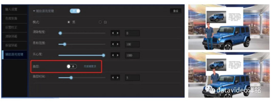 在实景应用里面,主持人或者嘉宾站在一个具体的物件的前方或者是后方是很好实现的,在虚拟环境里,我们要实现平滑的物件与人物的换层,却不是那么容易的。而DVK-400的一键开启虚拟辅助源换层功能即可轻松实现这一应用。比如下图里面的主持人与汽车之间的位置实现,便是通过这一功能一键开启实现的。