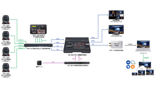 HBT-50不同于传统使用HDMI或SDI线缆设计的音视频方案受限于传输距离或者视频、控制和电源需同时多线缆布置,HDBaseT方案中每台摄像机位仅需一根网线,即能给前端摄像机进行供电,还能将前端信号传输至信号处理中心(信号切换),并且实现对前端摄像实时控制。HBT-50支持SDI 视频信号传输(最高 1080p50/60)和 HDMI 视频信号传输(最高 1080p50/60),最多可同时传输 4 台摄像机信号,最长可达100m,所以HBT-50既能保障信号高质量远距离传输,又减少了现场布线繁重的困扰,每台摄像机还能摆脱传统电源线供电的模式,在机位安装上,获得更多高度和角度的选择,给系统设计更多自由空间;加上HDBaseT的传输介质是平日里大家都在使用的CAT-6网络线,接口也是RJ45接口,安装简单,便于日后维护, 而一台HBT-50相当于4个HDBaseT解码器,可降低前端4台摄像机信号传输的总线缆成本。