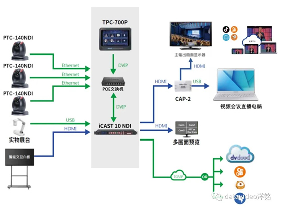 如上图所示,整套方案,传输使用NDI传输,在会场中使用了3台NDI云台摄像机(洋铭PTC-140NDI)进行拍摄,一台针对主讲人进行构图拍摄,一台对现场大全景进行构图拍摄,还有一台在观众区域跟踪现场发言的构图拍摄。