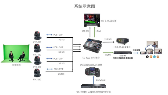 这套方案前端采用4台PTC-280 4K云台摄像机进行多角度的人物拍摄,并搭配使用RMC-300A多功能远程控制器,通过网络来远程控制前端每台摄像机构图及各项参数调整;虚拟抠像和信号切换则采用SE-4000来完成;录像设备采用ProRes 4K录像机HDR-80;同时使用4路网络直播录像编码器NVS-40进行编码推流,实现多平台同步直播。