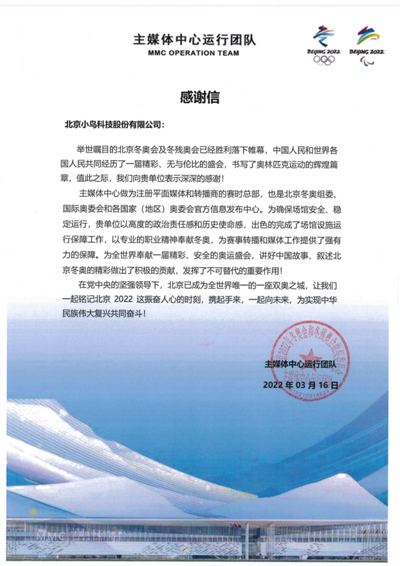 三天后,小鸟科技收到一封来自冬奥会官方主媒体中心运行团队的感谢信,对小鸟科技表达了高度的赞扬与肯定。除主媒体中心外,小鸟科技还参与建设并保障了冬奥会的四大中心:冬奥会开闭幕式运行监控中心、鸟巢赛事中心、鸟巢运行指挥中心、以及位于石景山首钢园的冬奥会和冬残奥会运行指挥部调度中心。