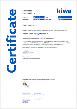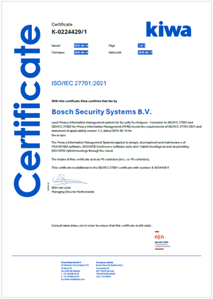 近日,作为安防及通讯领域值得信赖的合作伙伴,博世品牌会议系统与公共广播系统凭借坚实的技术基础,荣获国际权威认证ISO/IEC 27001与ISO/IEC 27701。这两项认证充分体现了公司在客户数据保护及业务运营中贯彻最高安全与隐私标准的坚定承诺。