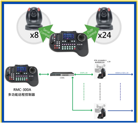 Datavideo洋铭RMC-300A使用DVIP协议通过以太网可以控制多达 24 台PTC云台摄像机和PTR电动遥控云台,使用RS-422 接口最多可以控制8台摄像机。每一台摄像机可做14个预置位存储。因此,现场拍摄时只需一键,就可以调取每个机位提前设置好的理想角度和景别画面了。