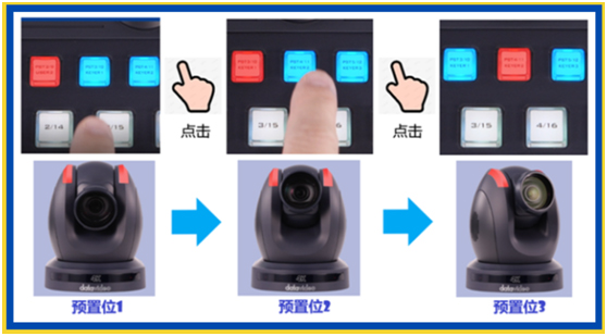 要知道,使用一个远程控制器同时控制多个前端摄像,这种模式十分节省人力,相当于一人抵一个摄像团队;所以,在会议前勘查好现场布局,把现场的每台摄像机预先选好的角度及构图“预存”起来,在正式拍摄时,调取RMC-300A的“预置位”这个便捷功能,就能快速在多个机位和景别中进行切换,从而会议录制的画面就非常丰富了。