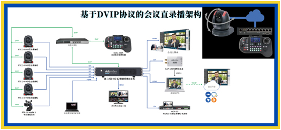 DVIP是Datavideo自主研发的网络控制协议,可以在以太网络环境下,通过DVIP连接和控制云台摄像机、电动遥控云台、切换台,很快还会加入录像机等后端处理设备的控制功能。RMC-300A基于DVIP协议,可以实现一人通过网络控制前端多台摄像机和信号处理切换的工作,顺利流畅地完成一场视频会议直播录播工作。